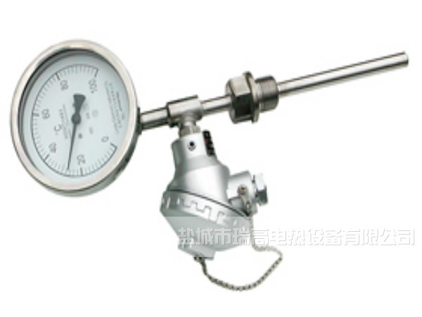 双金属热电阻(偶)一体化温度计(变送器)和电接点抽芯防护型双金属热电阻(偶)一体化温度计与变送器,它是在双金属温度计系列产品的基础上在套管内同时平行装入铠装热电阻(偶)的一种仪表。使用此表既可现场清晰地看到指示值,又可把信号远传到控制室。传到控制室信号有铂电阻 Pt10,K型E型热电偶信号,也有经过变送为4-20mA标准信号,起 到了一表两用的作用。使用此表在管道上可以少开一个孔,少了一个泄漏点(因事故常出在开孔处),它的价格比用两只表的价格便宜。所以说,此表既有实用价值,又有经济价值。(铂热电阻也有非铠装式)