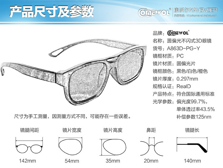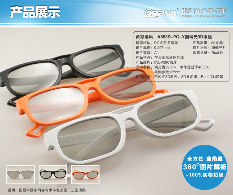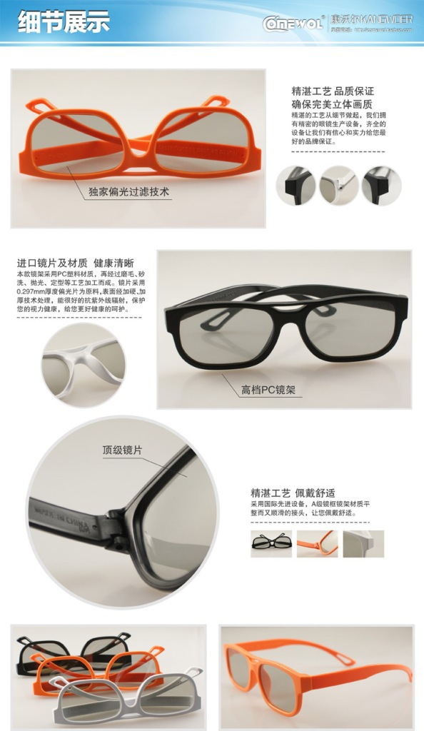 产品主要包括:户外运动眼镜、司机眼镜、滑雪眼镜、安全眼镜、摩托车眼镜、篮球眼镜、军迷眼镜、激光防护眼镜、骑行眼镜、特种功能眼镜及主动式电子快门眼镜、高清3D机顶盒、偏光投影片、DLP投影眼镜、线偏光眼镜、圆偏光眼镜、红蓝立体眼镜、品红草绿立体眼镜、棕蓝立体眼镜、纸材眼镜、塑料眼镜、互补色眼镜、电影院眼镜、3D电视眼镜、3D显示器眼镜、PC电脑电子眼镜、DLP投影机眼镜、光谱分离眼镜、光分离眼镜、解码眼镜、立体视频眼镜及其他光学片材等产品的开发、生产、销售。