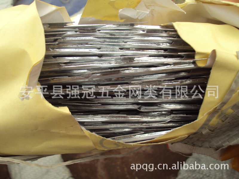 刀片刺绳防护网是一种新型防护网。该产品具有吓阻效果好.美观.施工便利.经济实用等优异特点。刀片刺绳防护网主要用于园林公寓.机关单位.监狱.哨所.边防等的圈禁防护。刀片刺绳防护网由锐利尖角镀锌钢板或不锈钢薄板做刀片,高张力钢丝做芯线组合而成的阻绝器材。由于刀片刺绳防护网造形独特不易触摸,因而能达到极好的防护隔离效果。直线形刀片刺网由刀片型直线刺网交叉焊接成型,可用于防盗窗、高速护栏、隔离栅。施工迅速、效果显著。刀片刺绳防护网,有多种架设方式可供选择,施工迅速,既省经费,又可达到吓阻的效果。产品特点:防腐、防老化、抗晒、耐久等特点。防腐形式有电镀、热镀。工艺:刀片刺网由热镀锌钢板或不锈钢薄板冲压出尖锐的刀片状,高张力镀锌钢丝或者不锈钢丝做芯线组合而成的阻绝器材。由于刺网造形独特不易触摸,因而能达到极好的防护隔离效果。产品的主要材质有镀锌板和不锈钢板。分类:刀片刺绳按照安装方法不同可分为:(蛇腹式) 螺旋式刀片刺绳,直线型刀片刺绳,平板式刀片刺绳,刀片刺绳焊接网等。片刺绳按照安装方法不同可分为:(蛇腹式) 螺旋式刀片刺绳,直线型刀片刺绳,平板式刀片刺绳,刀片刺绳焊接网等。刀片刺绳大略分为螺旋型、直线型、螺旋交叉型三种形式。