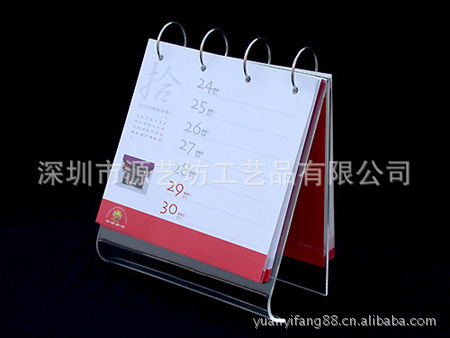 亚克力台历架主要由亚克力材质制作而成。台历架上面是两个银环扣住台历,其余部分由透明亚克力面板热弯而成。这款亚克力台历架使用了开槽、打磨、热弯等工艺,使得此款亚克力台历架显得更加的精美、精致,体现出它本有的个性台历架的特点。