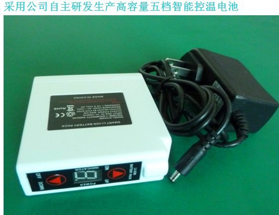 2、智能温控锂电池体积小巧,放置在口袋内,携带方便,随时开关和调温,用完充电.锂电池前3次充电,充足12小时,以后每次充电,充至电器和锂