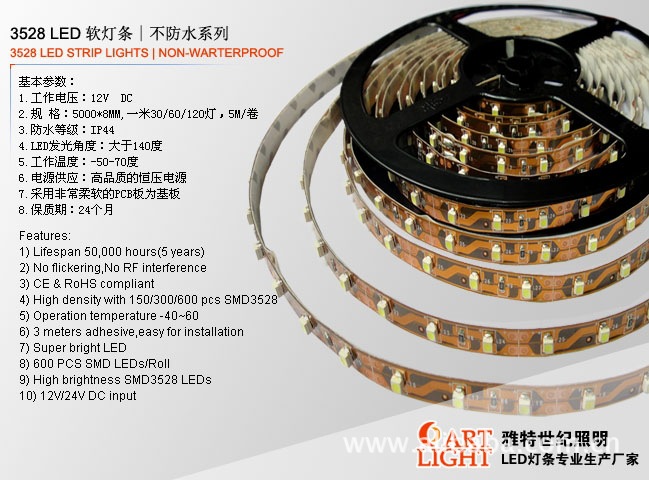 2、灯的数量:3528系列有60灯/M,120灯/M;宽度有5mm,8mm,10mm,5050系列有30灯/M,48灯/M,60灯/M;宽度有10mm,12mm,15mm;