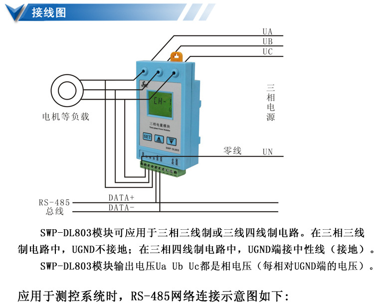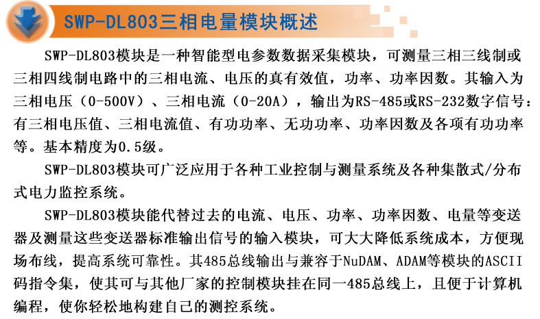 SWP-DL803模块是一种智能型电参数数据采集模块,可测量三相三线制或三相四线制电路中的三相电流、电压的真有效值,功率、功率因数。其输入为三相电压(0-500V)、三相电流(0-20A),输出为RS-485或RS-232数字信号:有三相电压值、三相电流值、有功功率、无功功率、功率因数及各项有功功率等。基本精度为0.5级。