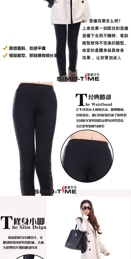 时尚秋冬新款韩国仿皮打底裤 黑色亚光亮光侧拼皮加厚打底裤