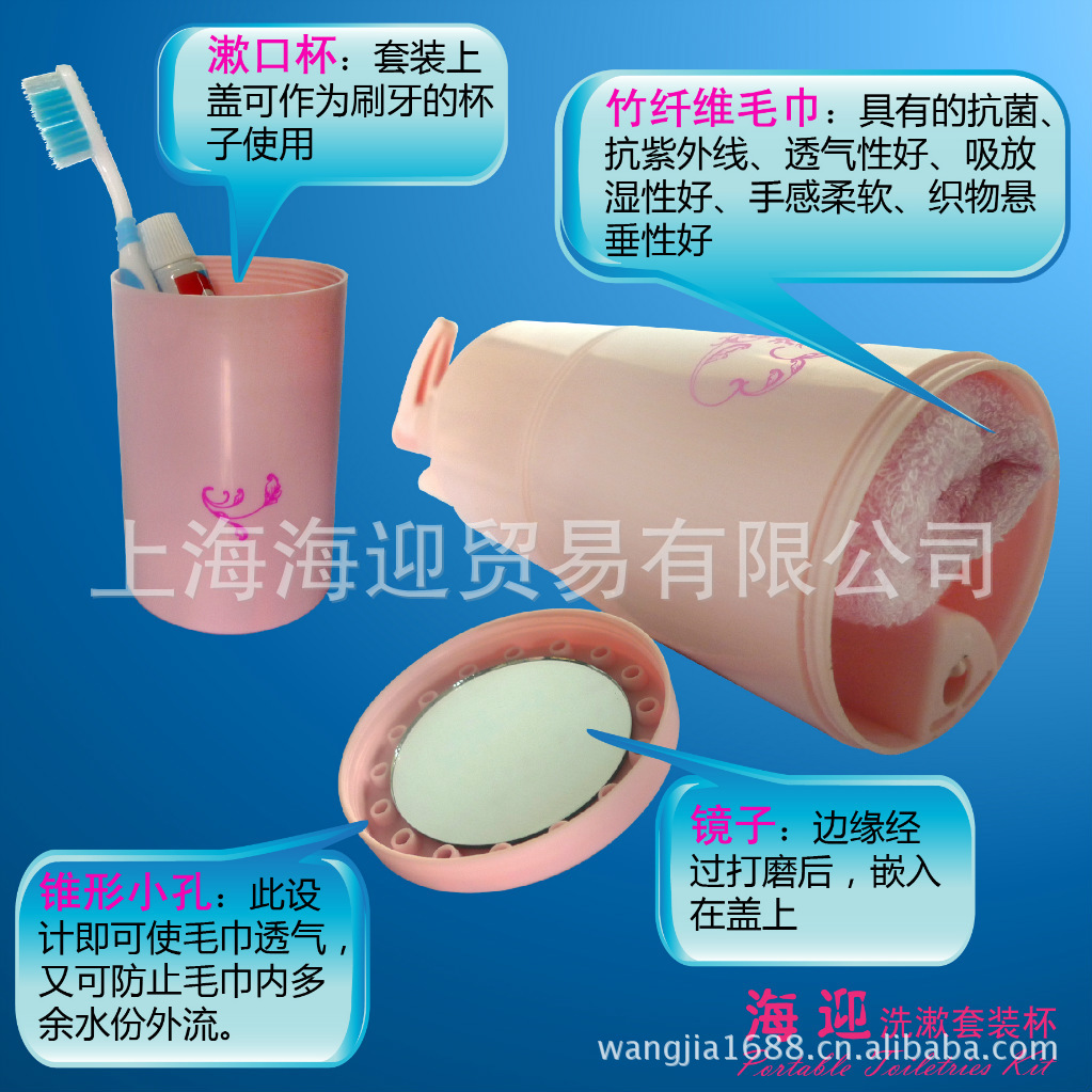 使用说明:拧开上盖,是一个可以使用的漱口杯。看见2个乳液泵,分别是沐浴露和洗发水,用完可以根据自己喜好需求加注沐浴露和洗发水,中间是的是把木梳,在后面有一把牙刷和牙膏,都是大众化的规格,用完都可以换! 拧开下盖(底盖16个锥形空防止毛巾是湿的时候水会不漏出来),盖底有个一个小圆镜,下面而且含有一个方巾。