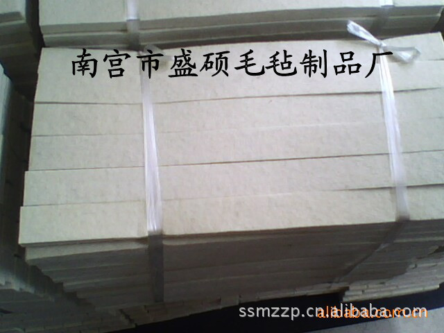 我厂生产产品主要有各种规格的平面毡,如:细白羊毛毡,中粗羊毛毡,抛光毡,杂毛毡,彩色毛毡等。还可制作各种规格的毛毡零件,如:毛毡轮,毛毡条,毛毡环,毛毡垫,毛毡筒等。还可根据用户图纸要求制作各种异形毡零件。 产品广泛应用于:机械、机电、化工、水泥、轻纺工业行业,也可用于大理石、不锈钢、精密家具抛光、飞机、汽车、火车、轮船、机床等设备防尘,密封、隔音、保温、绝缘、绝热其性能使用良好。产品畅销全国二十多个省市, 并远销到日本、法国、澳大利亚等国家,并深受广大客户的好评。 毛毡采用天然羊毛制成,利用羊毛的缩绒特性经机加工粘合而成(非经纬交织)。