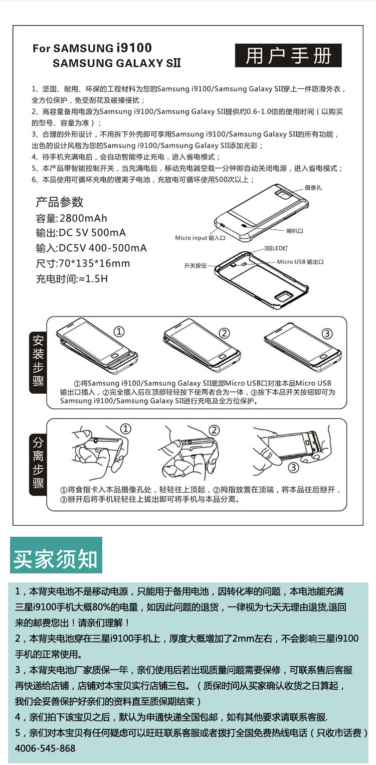 三星Galaxy Note I9100 2800毫安超大容量背夹电池+超薄保护外壳