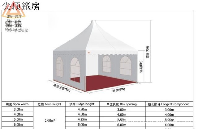 b.四边形锥顶篷房分为3*3m,4*4m,5*5m,6*6m;