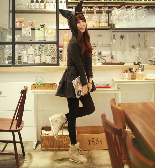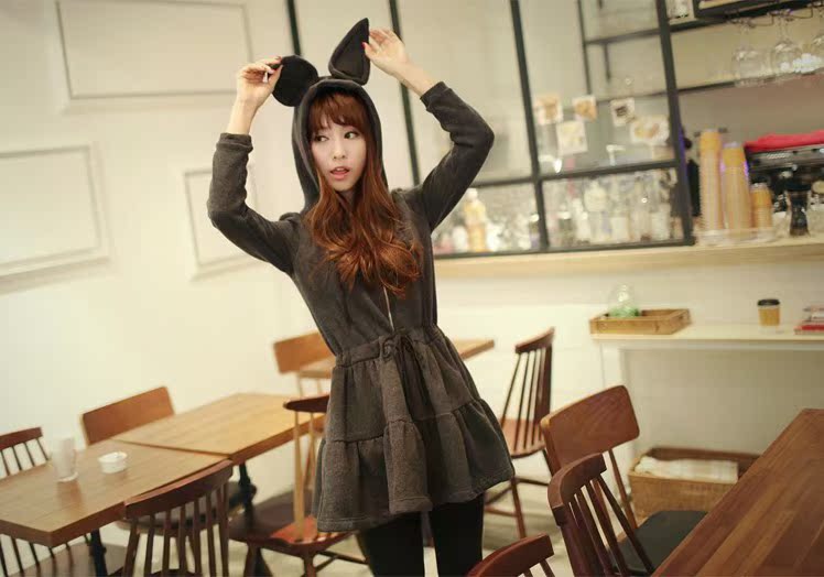 韩国女装可爱恶魔角兔子耳朵蓬蓬连帽长袖抓绒卫衣连衣裙HK3152