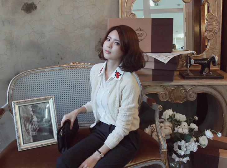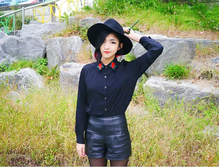 批发 韩国复古森林系女复古刺绣玫瑰小花朵翻领雪纺衬衫HK3166