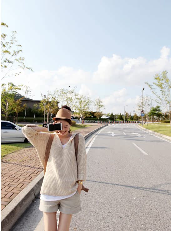 厂价直销 新上市女装畅销 V领连帽宽松套头纯色打底毛衣 ME183