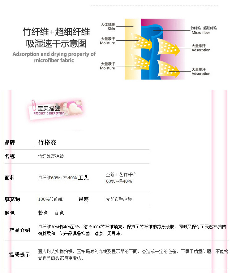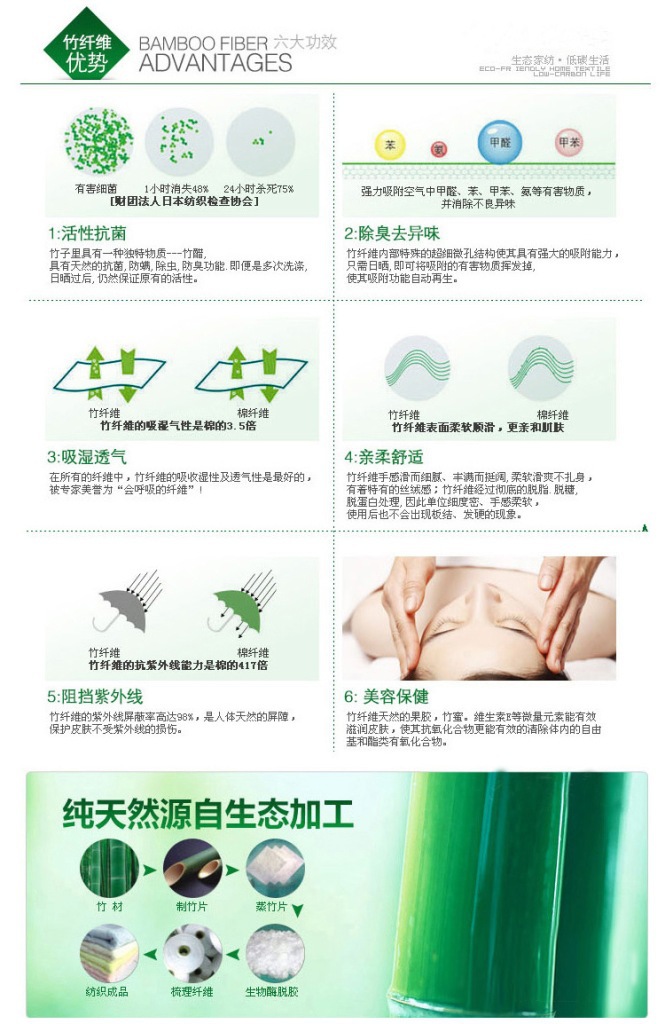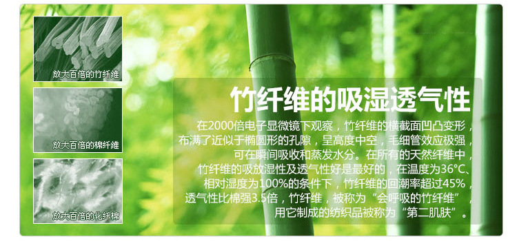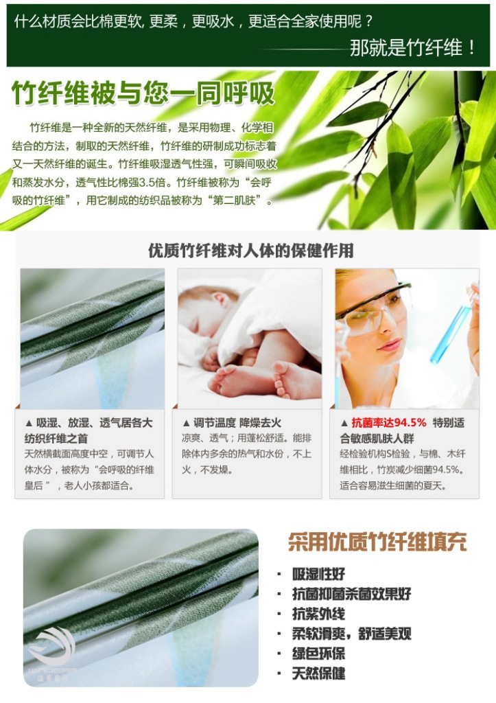 竹纤维被的优点:柔软滑爽,似绫罗绸缎,悬垂性好,吸湿透气,冬暖夏凉。抗菌,杀菌率百分之七十五,抗紫外线,具有天然的防螨,防臭,防虫和产生负离子的特性,并能有效阻挡紫外线对人体的辐射,不会对皮肤产生刺激,其织物经多次反复洗涤, 竹纤维比人的头发还要细,竹纤维具有平滑和圆润的表面,不会对皮肤产生刺激。