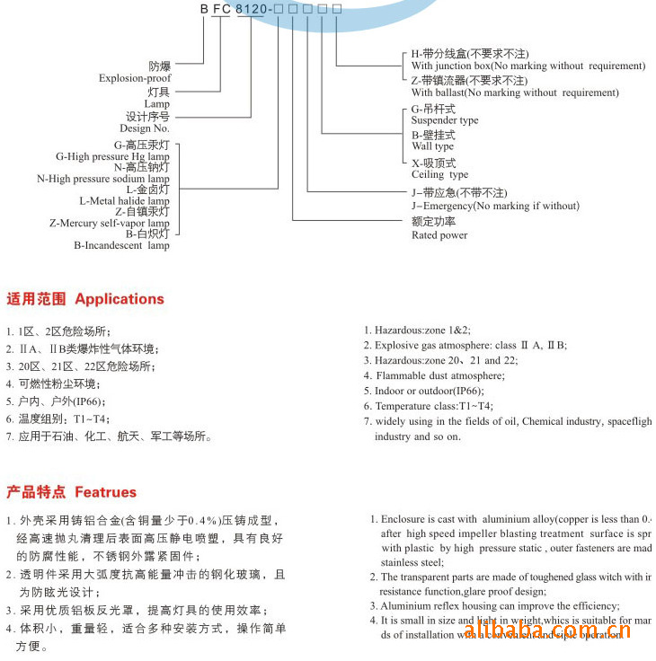 | ● 适用于爆炸性或可燃性粉尘环境作固定照明。 ● 适用于室内外作业及施工现场等场所作固定照明。 |