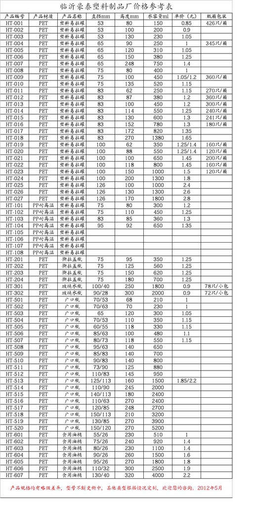 临沂豪泰塑料制品有限公司(原笑原塑料制品厂),位于中国著名的批发城、物流之都——山东省临沂市。公司现主要生产:PET塑料易拉罐、PP耐高温易拉罐、广口瓶、食用油桶、汽车玻璃水瓶、饮料瓶、各种型号瓶坯、瓶盖、等其他塑料包装产品。网上有意订购产品客户,欢迎索取样品,根据客户情况样品,可以免费送、运费自己付,欢迎直接来厂进行当面咨询订购。本厂已通过QS认证,产品质量绝对合格,价格合理。另外,本厂还订做各种异型产品,代上机器,模具制作等。由于原料价格浮动、网上价格仅供参考,详情需咨询客服。