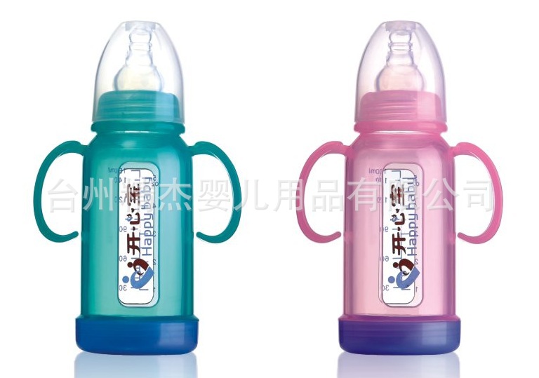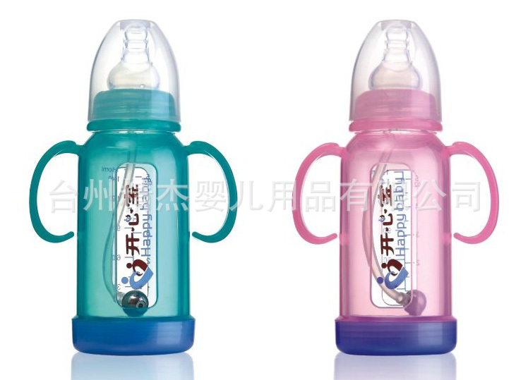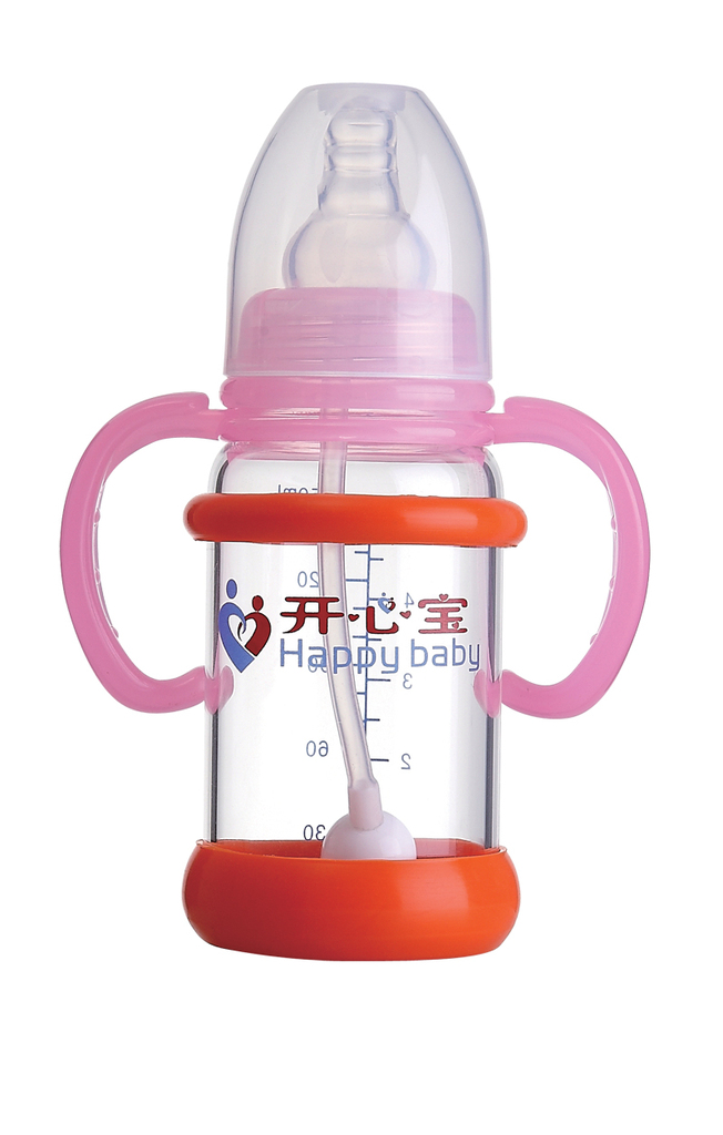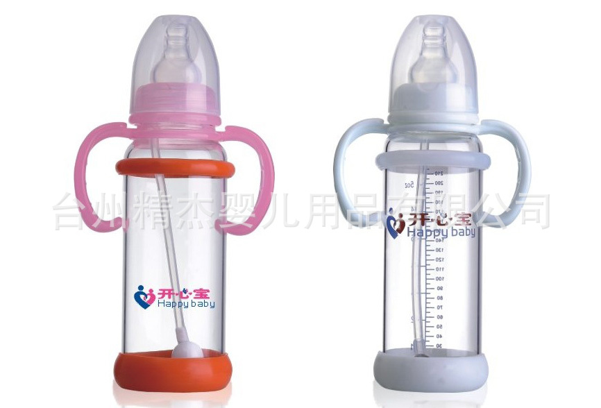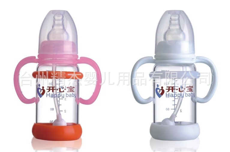 【特点】:瓶身采用高硼硅为原料制成,不含双酚A,高透明,耐久性,易清理等,可耐高温600度,耐感变温度200度,膨胀系数高达31%,人性化瓶身防爆壳设置,不易破碎,双手柄有弧度设计,利于宝宝抓握。