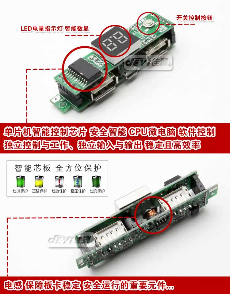 【朋友您好】市面上很多移动电源为了简单和省成本,采用的是硬件方案,硬件方案是持续固定升压,这样当您把移动电源放置半个月左右时电量就会明显减少或没电,另外硬件方案无法同时做到明确的电量指示、充电时电量渐进指示、有负载时指示和无负载时智能休眠、双击开关开启LED照明灯等人性化功能,更重要的是硬件方案安全性较差,无法真正实时的做到过充保护,过流保护,过压保护,因为硬件方案没有单片机,不能智能分析和实时准确的处理数据,要靠电芯本身及硬件线路来防护,这样的防护是比较脆弱的,类似马后炮,这也是硬件方案的产品返修率较高且不耐用的根本原因之一,比如当电流过高时,硬件方案是靠电子元件本身的物理特性来做极限防护,这个值的不可控范围太大且容易失效,失效后强电流直击电芯就容易引起电芯正级自带的过流片熔断,从而导致电芯报废,而软件方案可以准确的用数据来判断电压、电流值,用软件程序预前控制可能产生的危险及调整至正常状态,从而保证产品的安全性和耐用性。这款佳翼Y113就是采用上述先进的软件智能方案。