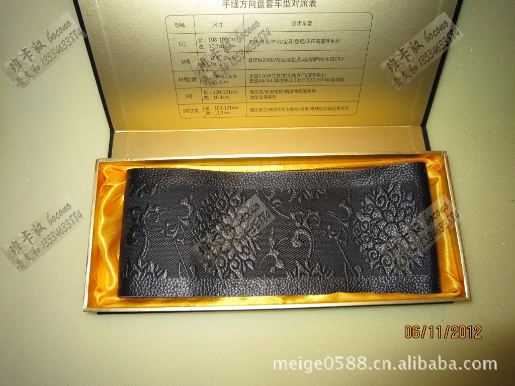 【产品名称】:一节进口牛皮压花吸汗透气手缝方向盘套
