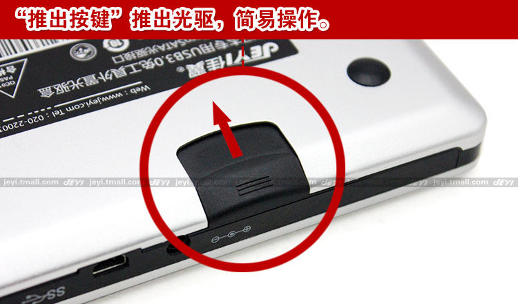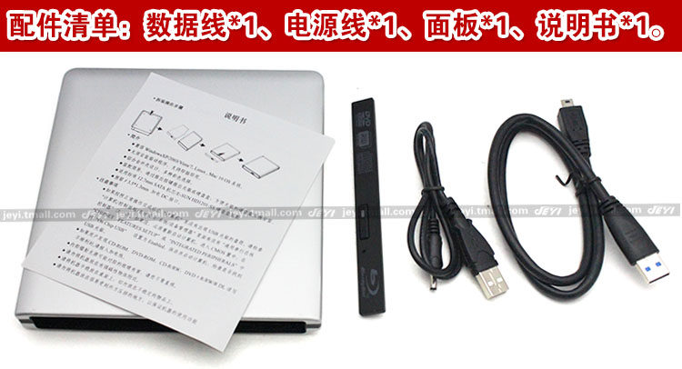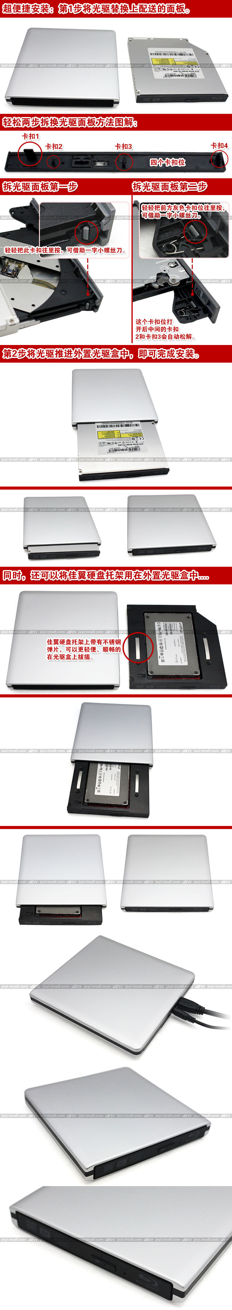 【产品型号】佳翼H213 USB3.0(免工具、全铝合金外壳)【对比确认】请您将机器的光驱拆下后对比下图确认以下二点:【其他选择】若您的光驱是托盘式9.5mm厚的请点击这里选择佳翼H202;若是吸入式12.7mm厚请点击这里选择佳翼H208,若是吸入式9.5mm厚请点击这里选择佳翼H206。若您的光驱不是上述类型,请联系我们的客服为您推介合适的产品。【选择理由】装配简易,多种彩色可选择;无需安装驱动程序,无需工具安装,支持即插即用。不单只适用于光驱而且还适用于硬盘托架,插入光驱时就变成了USB3.0移动光驱,插入硬盘时就变成了USB3.0移动硬盘。产品质量问题一年保换,五年保修,本产品无需接辅助供电线亦可正常使用(少数耗电大的光驱可能需要)【温馨提示】拍下后请您留言喜欢的颜色,若无留言默认给您发黑色哟...【所含清单】USB3.0光驱盒*1、数据线*1、电源线*1、光驱面板*1、说明书*1。