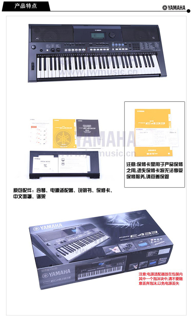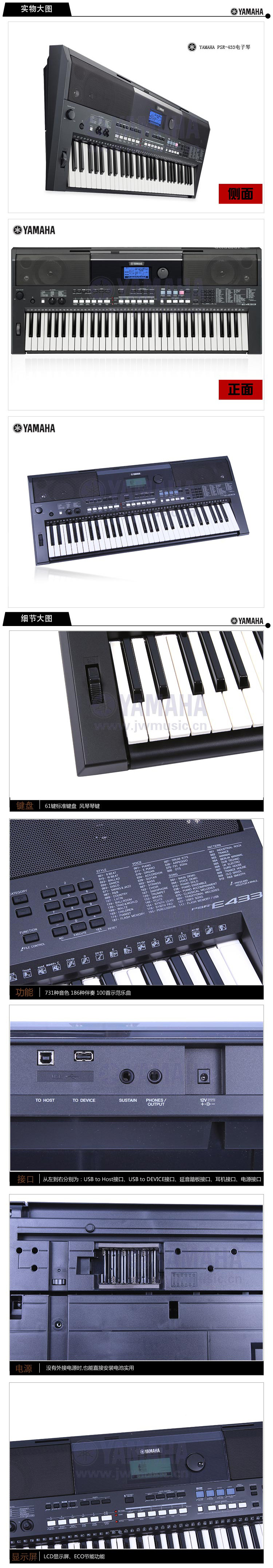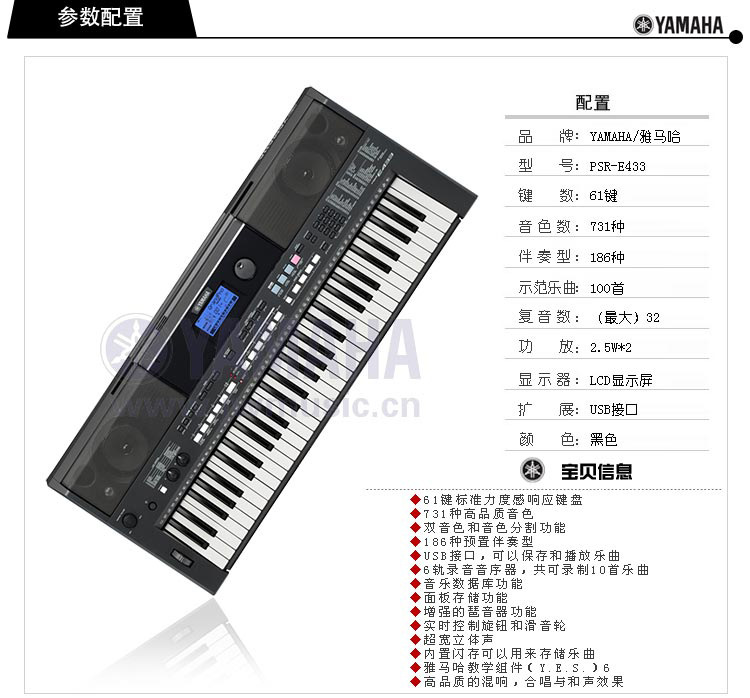 PSR-E433内置了731种高品质音色,从原声音色到电声音色一应俱全。这些音色使用了雅马哈最先进的采样技术,并且做了后期的加强处理,对扬声系统也做了一定幅度的低频提升。