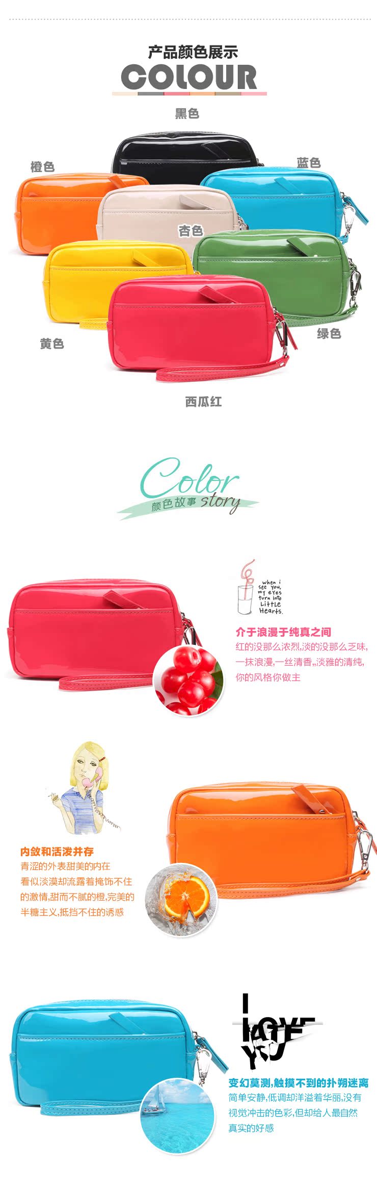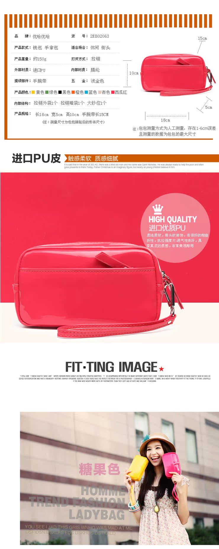 名称:2013春季新款 韩版糖果色女式钱包长款手包卡包面料:PU尺寸:18cm长x10cm高x5cm宽颜色:黑色 黄色 蓝色 绿色 西瓜红MOQ:1000个型号:YK---HS201381557