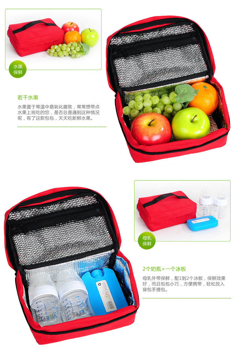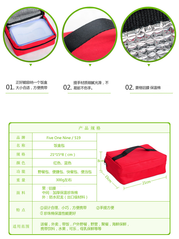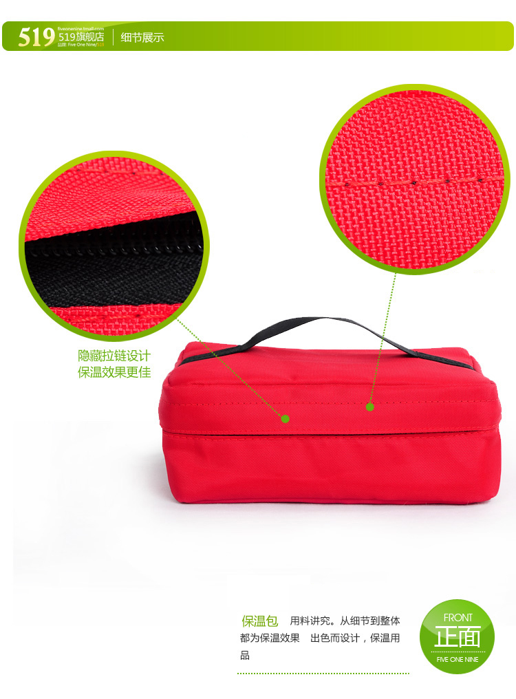 名称:2013保温包 饭盒包┃便当盒 午餐盒 便当包┃冰包 带饭包 情侣款材料:里:铝膜 中间:隔热珍珠棉 外:防水尼龙(出口级材料)尺寸:长21x宽15x高8cm【适用】送餐,外卖,带饭,户外野餐,野营,聚餐,海鲜保鲜,携带饮料,水果,可乐,母乳保鲜等等。颜色:蓝色+饭盒 红色+饭盒 红色型号:YK---HS20138245MOQ:1000pcs一、订做事宜: 1、产品可根据客户提供图片和样品订做,更换材料、颜色,也可控制成本生产,以达客户要求。还可以根据客户需求重新设计订做。 2、可以根据我们网站上的款式图片款式订做,加LOGO,细则如下(LOGO订制) 3、我们的款式每款每色1000个起,总数500到800个可以下单生产,生产起订数量1000个起。 4、设计打样要求:起样品视情况而定收取300-500元不等的费用,具体实际样板可双方协商,打样周期一般为3-5 天.二、LOGO订制: 1生产订货时可根据客户要求订制客户要求的标志/LOGO。标志/LOGO一般的工艺有(绣花、印刷、热压模、五金、胶牌等)。2 打样添加客户LOGO时,如LOGO需要印刷单色可免费,多色印刷根据颜色而定,加绣花根据客户的LOGO的针数而定。 五金开模做的需要费开模费根据复杂难易程度而定。三、生产期限:产品的交期(不含打样时间、运输时间)以及产品的价格也根据订货量而定,数量不同交期不同,具体的双方协商解决。四、付款方式: 下订单时预付30%的定金,余款70%提货时付清。五、定制说明1、如果您想订购产品,请联系我们公司人员。2、我们会考虑您的需要,推荐产品照片/图片供您挑选,或者按照您的样品或图片尽快做出样品。3、对您关心的样品,我们会及时同您联系,确定款式、数量、价格后,我们会尽快打出样品让您确认。4、双方确认包装要求、付款方式、交货日期等。5、我们保证产品的制作质量和交货日期。6、运输说明: 一般情况下走物流或快递,运费到付。7、未尽事宜,可详谈后在合同注明。康顺是包包行业的专家,我们将提供令您满意的售前、售后服务! 品质+价格+可靠的保障服务=一个都不能少手机:18024487549 18002808458联系人:CharliseQQ: 774871661 旺旺号:yk20081818邮箱:Charlise@fashionebags.com