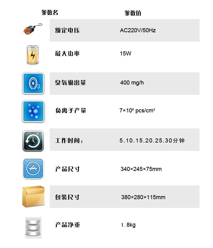 产品型号 | 最大功率 | 臭氧产量 | 适用面积 | 定时时间 | 净重 | 装箱台数 (台) | 机器尺寸(mm) | 装箱尺寸(mm) |