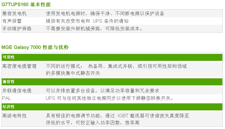 提高电源效率以实现业务连续性 MGE Galaxy 7000 是 MGE Galaxy UPS 系列最新增加的产品,它为大中型数据中心提供受安全保护的电源解决方案。 MGE Galaxy 7000 凭借其可靠的 IGBT 整流器/逆变器设计而具备灵活性/可适应性,可支持实际应用情形中所有类型的负载(电感负载、不会降低有源功率的电容负载)。 这种不带变压器的 UPS 系统可最大限度地提高系统效率(高达 94.5%),使高昂的运营成本保持在低水平(节能),同时为任务关键型负载提供最高品质的功率。 MGE Galaxy 7000 包含的特性和选件依然通过采用 N+ 1 并联/冗余模块并提供一些选项来解决客户的需求(包括让功率需求灵活地增长/扩展),这些选项包括: 串联冗余、集成式并联,以及集中式静态开关(此开关使 MGE Galaxy 7000 成为任务关键型环境的高可用性架构领域的引领产品)。 这款新型 UPS 的核心设计以易于安装和维护为基础,仅在产品正面提供了电气连接,产品组件都是完全可维护的。 MGE Galaxy 7000 还包含其他一些 UPS 解决方案,例如: 母线同步盒、IP32 机柜、反向馈电保护、频率转换功能,以及一些灵活且可延长运行时间的电池解决方案,包括 VRLA、NiCad、外部适配维护旁路柜及并联装置。 多功能 MGE Galaxy 7000 可与业界领先的通用通信协议进行交互,并在机架式多槽箱中置入了四个通信插槽来支持 SNMP、J-Bus/ModBus 和 RS232-RS485 协议,以便轻松地与大多数设备进行交互。 MGE Galaxy 7000 的可用服务包括:启动、预防性维护、快速响应时间,以及为实现无干扰系统维护而设计的综合服务包。
