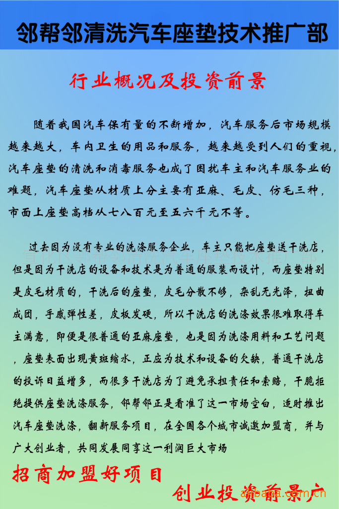 邻帮邻清洗汽车座垫技术推广总部成立于2004年,经过八年的市场经营论证和潜心的钻研,结合国内先进技术,开发出针对高档汽车座垫、座套、羊剪绒床上用品、大毯、沙发垫等皮毛产品的洗涤保养工艺,并具备配套清洗翻新汽车座垫的专业设备和清洗化料,拥有一套国内独一无二的专业工艺和技术。