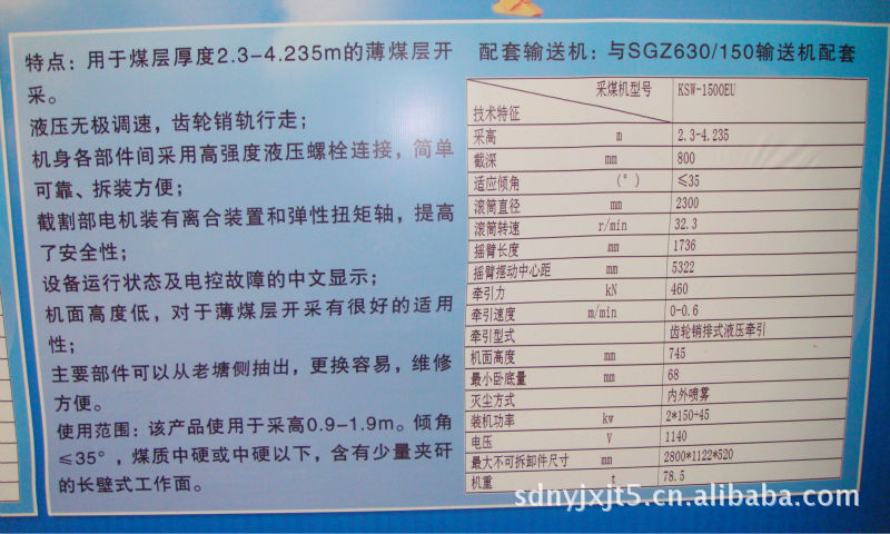 公司生产KSW-1500EU型、132/320-W型 、MG150/355-W、 DY150-W型系列采煤机 。与波兰柯派克斯股份有限公司合作生产的KSW-1500EU大型采煤机,具有较高的技术参数,被用于复杂的具有高生产能力的工作,具有自己承载的结构,适合厚煤层采掘,该采煤机的成功研制填补了我国厚煤层开采技术的空白;MG132/320-W型、MG150/355-W型采煤机,全液压自动调速的无链双驱动牵引采煤机,适用于缓倾斜或倾斜,煤质中硬以上中厚煤层;DY150-W型单滚筒无链牵引采煤机,适用于高档普采及综采工作面;MG160/375-W型采煤机系多电机驱动,截割电机YBC-160KW两台,牵引电机YBQYS-55KW一台,均横向布置,采用新型液压牵引箱,泵、阀高度集中,并干腔布置,维修方便,适用于缓倾斜或倾斜、煤质中硬、中厚煤层。