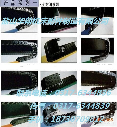 我厂专业生产各种机床附件产品主要包括拖链、塑料拖链、工程塑料拖链、钢制拖链、不锈钢拖链、防护罩、风琴罩、卷帘护罩、导轨式防护罩、风琴式防护罩、柔性风琴式防护罩、不锈钢防护罩、排屑机、冷却管、垫铁、金属软管、导管护套、工作灯、软管和接头等。