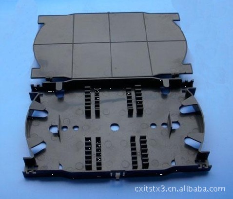 光配线产品,塑料配件。熔接盘是组合在光缆交接箱体内,光缆一部分光纤与尾纤熔接用于连路调度,另一部分与其它光缆直接对接(直熔)。熔接盘是对每一根光纤,互相任意连接,配合使用。熔接盘采用高强度工程塑料注塑成型,阻燃、强度高、抗老化时间长等。