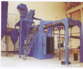 抛丸清理生产线|表面处理抛丸|吊钩通过式抛丸机|悬链式抛丸机|吊链式抛丸机|步进式抛丸机|抛丸清理机|悬链式抛丸机|悬挂通过式抛丸机|悬挂通过式喷砂设备|吊挂通过式抛丸清理机|挂式喷砂清理设备按其吊链移动方式,可分为连续式、步进式、积放式。按吊链布置方式,可分为单行程、双行程和多行程之分。 连续式是将工件悬挂在吊链钩上,匀速连续循环地通过抛丸室,进入清理室后,在自转机构的驱动下工件一边自转,一边前进,一边接受清理的工作方式。 步进式是将工件悬挂吊钩分组(一般3钩一组),吊钩的组数是依据客户的工作频率要求和整个清理线的长度而定。其工作次序为上料→等待→抛丸(自转)→等待→下料→等待→上料依次循环工作。
