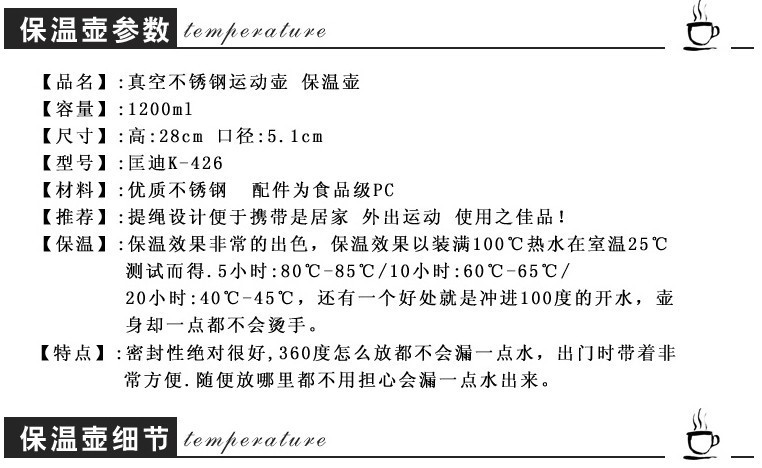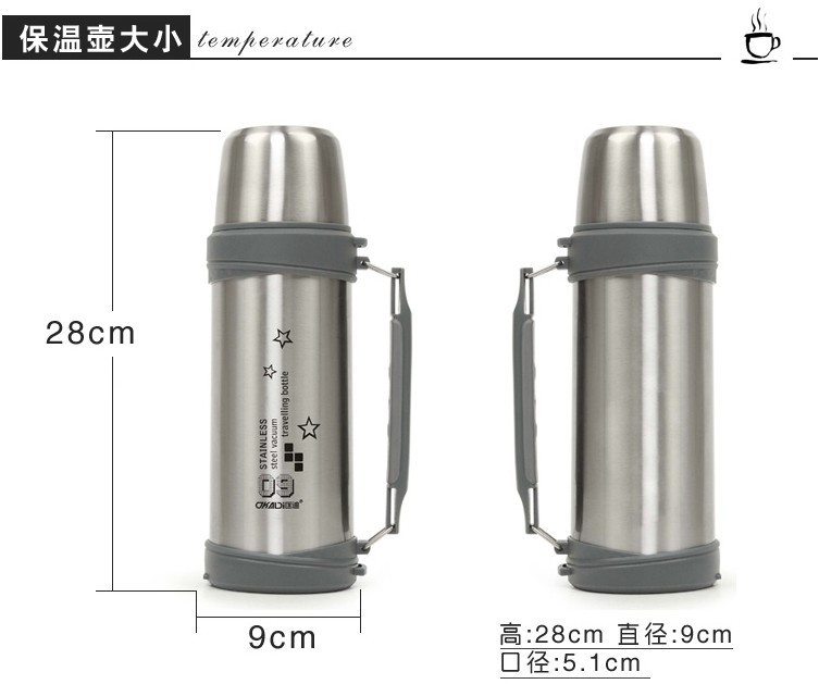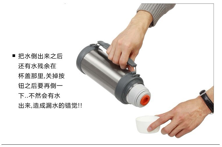 4.保温:真空无尾夹层内胆。可保持温度10小时左右;不但适合年轻人日常.旅游使用,而且更加适合婴儿和老人外出携带开水,使给小孩喂奶,老人吃药都变得很方便。
