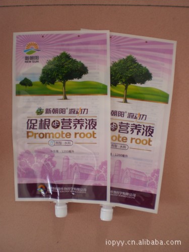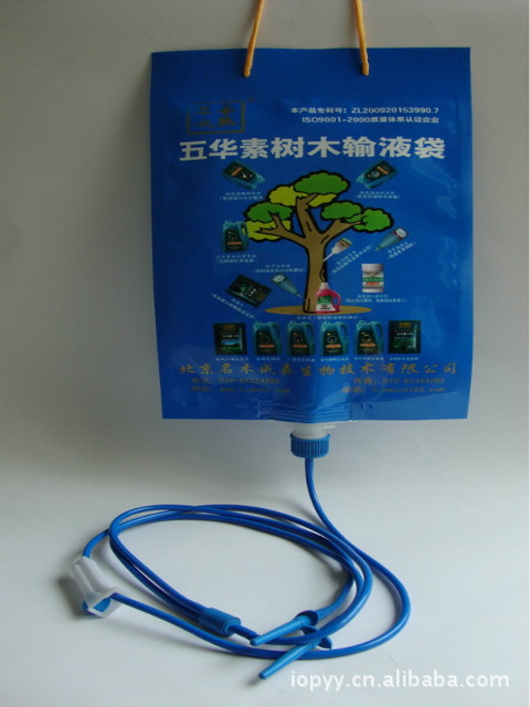 产品名称: 大树成品吊袋液适用范围:大型乔木、灌木、花卉的移栽,根系受损严重、长势弱、新种的苗木果树、大规模的植树造林等。功能特点:本产品主要是借鉴了人体输液系统的原理,对出现“病症”的树木、花卉等植物进行输液,促进植物伤口的及时修复,改善不良的营养系统,优化植物营养吸收机理,加速植物的快速生长,减少生长周期,提高经济效益。本品富含植物生长所必须的有机活性物质和营养元素,使用后可刺激植株细胞分裂,激活根髓组织活性,促进弱树变壮,迅速恢复生长状态,大大降低树木出现病症后的死亡率。本品还可促进新芽形成,叶片生长迅速,改善植物长势,解毒愈创,有效克服小叶黄叶,绿叶效果明显,缩短康复时间。使用方法:如同人体输液一样,直接插在植物树干对植物进行输液10天左右用一次,视树木生长状况连用2-3次。注意事项:(1)不能与碱性物质混用。(2)高温干旱天气使用时应适当增加兑水量。(3)苗期使用适当增加倍数和适当减少次数。(4)配合大树营养液,效果更佳。贮藏: 密封于阴凉干燥处,儿童不宜接触,禁止饮用
