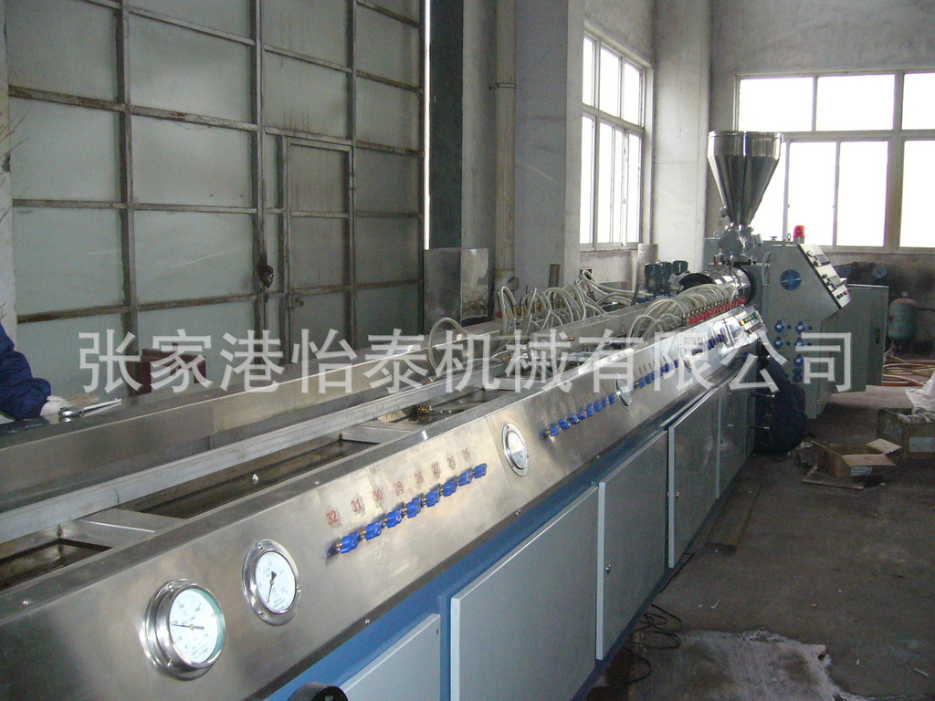木塑踢脚线设备是利用植物纤维和塑料原料混配复合组成的材料,采用高准效锥形双螺杆挤出,配备强制冷却却系统挤出成型。