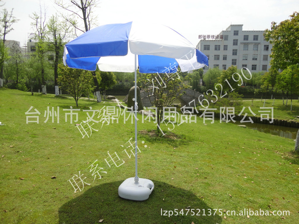 太阳伞细图塑料装水伞座 本公司坚持“高质量是本公司的最大的回报,客户满意是本公司的服务宗旨的质量方针,坚持“低利润,守信用,保证质量.公司技术力量雄厚,生产设备先进,是集开发、生产、销售为一体的专业生产厂家公司的主要产品有:折叠桌、塑料桌椅、太阳伞、折叠帐篷、折叠床、展业桌、广告桌等休闲用品系列。产品推出市场以来,深受客商的青睐,远销欧美、东南亚等国家和地区。产品特点:防锈、防晒、防嚗、防变形,设计新颖、折叠方便、重量轻,易携带省空间等杰出表现。适用于郊外野餐、打牌、麻将…;别墅、天台、花园、船上、路上、沙滩休息享受日光浴…;单位节日咨询,产品推介…;河溪边垂钓…;