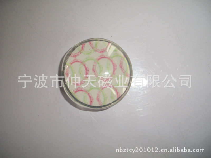 9)玻璃冰箱贴:采用下面软胶磁铁+上面铜版纸彩色印刷+半圆玻璃窗腹膜制作而成