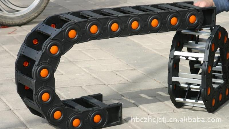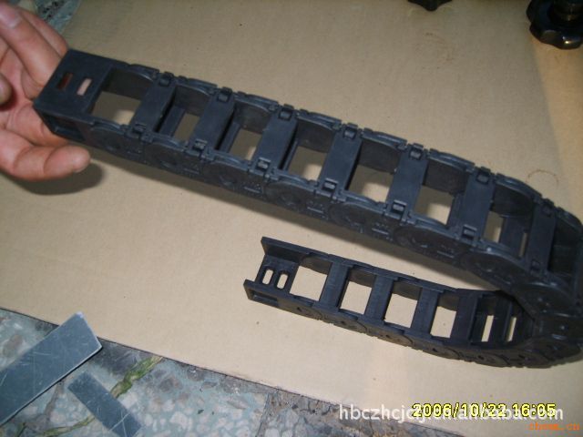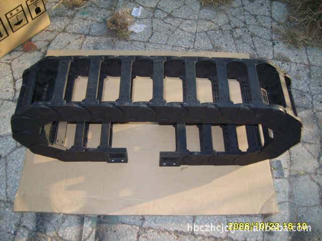 (3)单元链节由左右链板和上下盖板组成,拖链每节都能打开,装拆方便,不必穿线,打开盖板后即可把电缆、油管、气管、水管等放入拖链。