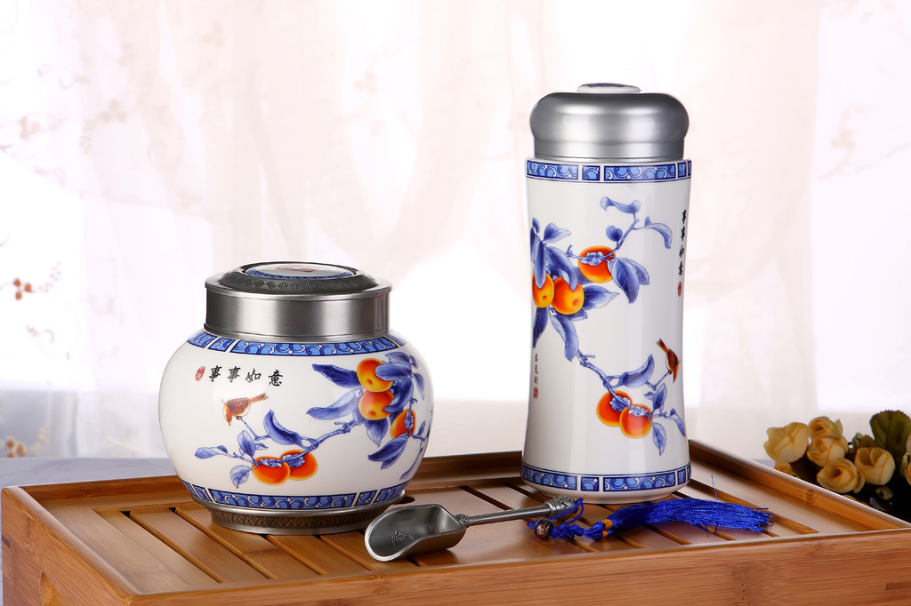 事事如意系列陶瓷保温杯+2号茶叶罐 精品钧瓷茶具套装礼品