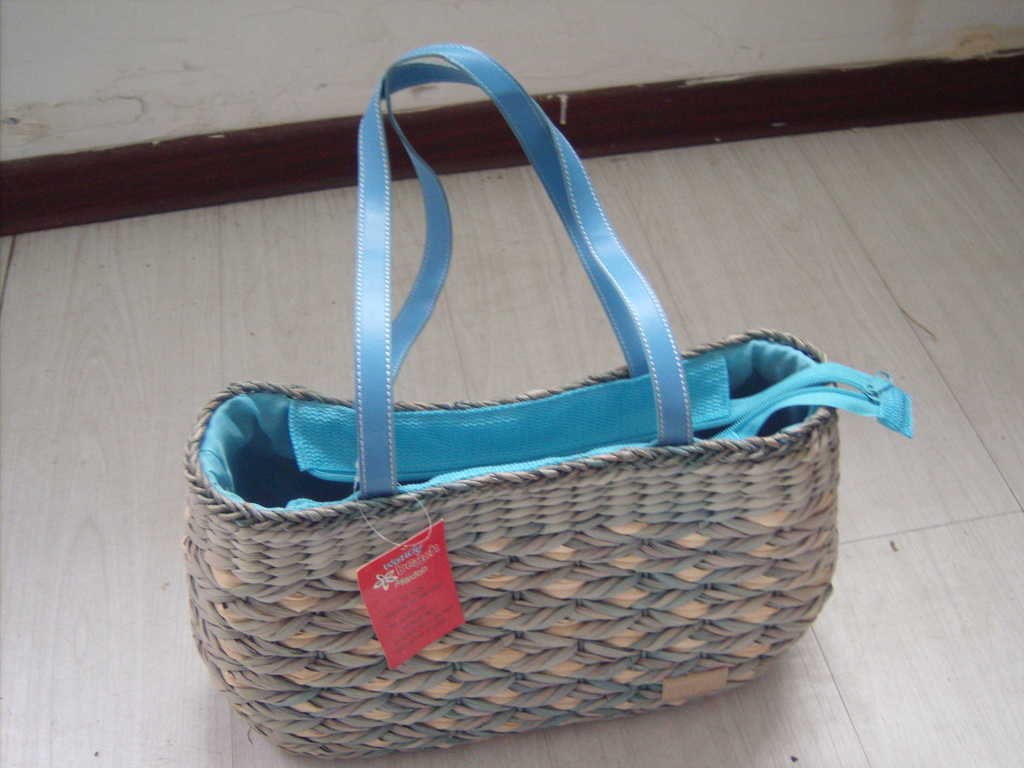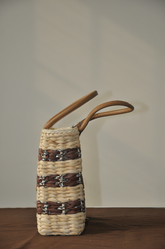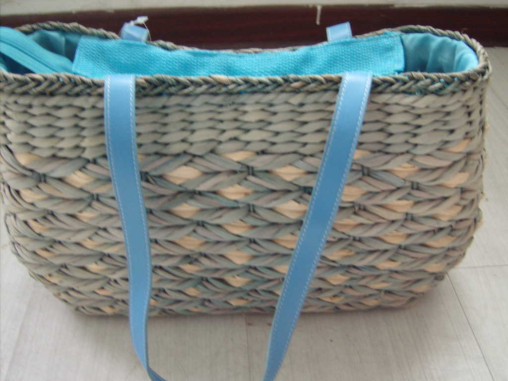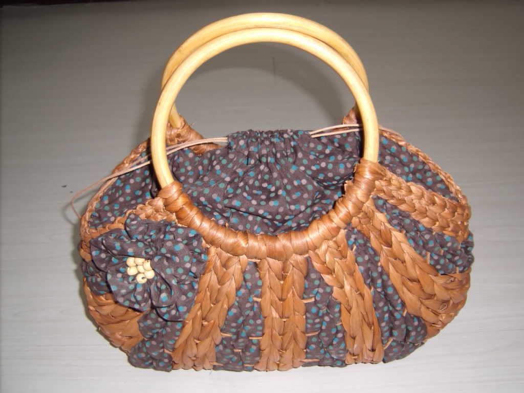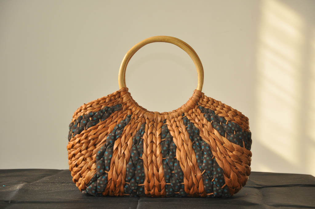 原材料为玉米皮、麦秸,它的本色为白色,主要特点是看上去光泽度稍差一些,手感有些粗糙,纹理一般较宽,给人粗犷感。而且它的吸湿性强,夏季手拎或者肩挎都不会让你在出汗时有滑腻感。玉米皮编包另一个主要特点是它在加工时容易上色,颜色的过渡性比较好,调色性也强,如果发现包身有起刺现象,用修剪刀剪掉即可。有原色直接编织,有先用已经染好色彩的玉米棒皮编织,还有一些是用本色编织后再缝上一些色彩鲜艳的图案,总之编织出的东西美观大方。