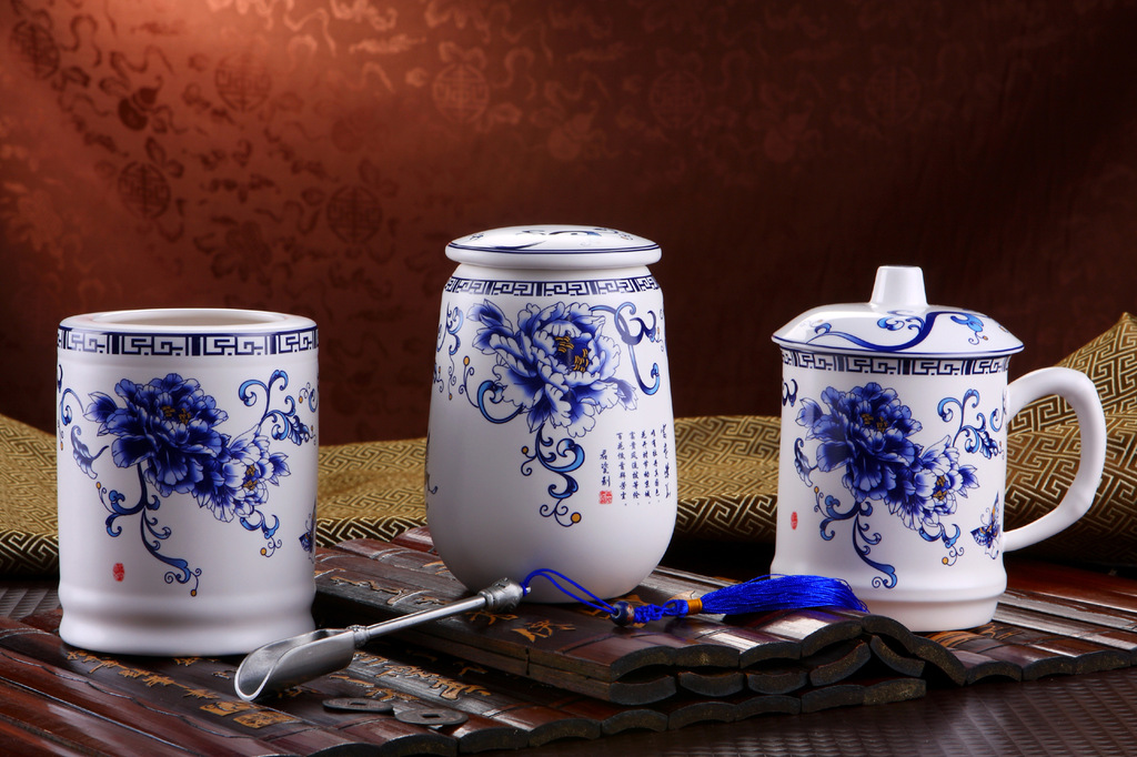 新品陶瓷笔筒批发 泰和君瓷福临门竹节青花瓷茶杯三件套装