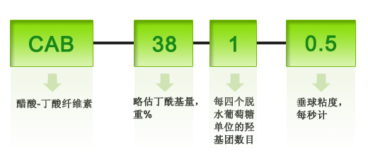 | CAB醋酸-丁酸纤维素 | 粘度b(秒) | 乙酰基% | 丁酰基% | 熔度范围oC | Tg,oC |