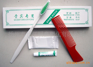 产品描述:瓦楞纸包装 牙具: 牙刷采用PP+TPR材料 刷毛采用优质尼龙丝 耐热温度 80℃ , 清爽薄荷香型6g黑妹牙膏;梳子:高档折叠梳;洗发液,淋浴液,润肤露,护发素:30g软管力士香型;香皂:30g力士香型;浴帽:一个拷边芯;针线包:二针六色线;擦鞋布:纯棉加绒,手套式,口袋式加大;口杯罩:油纸;杯垫:吸水棉纸;圆珠笔:铜头刀型或条形;拖鞋:纯棉,毛巾加大号;剃须刀:按摩手柄,双层不锈钢刀片加10g须膏;护理包:双面修甲挫,4支棉签,消毒棉.