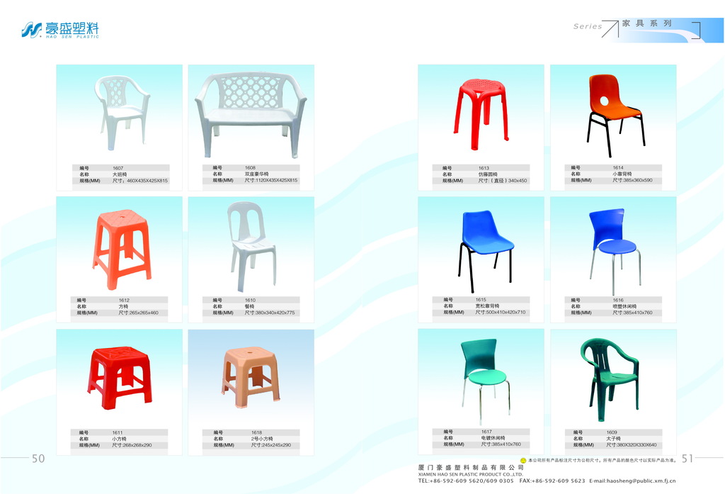 3.塑料生活系列产品主要有:塑料圆桌、塑料方桌、塑料椅、塑钢椅、塑料方凳、儿童桌椅、塑料提桶、垃圾桶、塑料水箱、塑料盆、纸篓等,品种达数百余个;