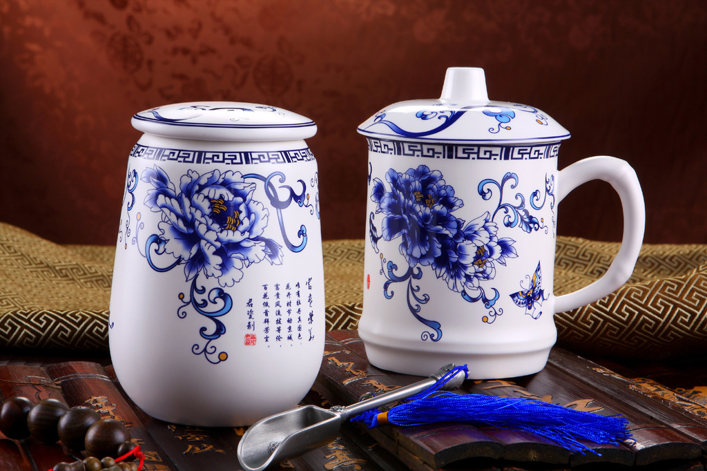 新品陶瓷笔筒批发 泰和君瓷福临门竹节青花瓷茶杯三件套装