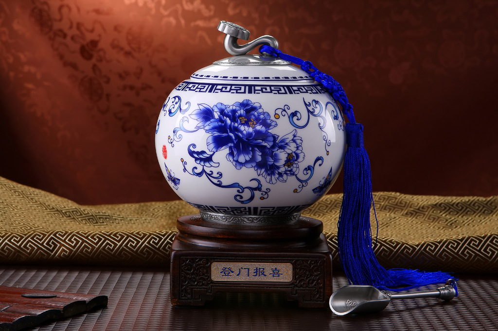 供应 陶瓷礼品批发 深圳泰和君瓷福临门青花瓷如意茶叶罐