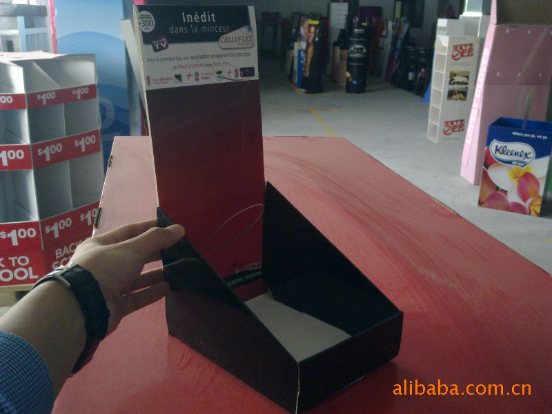 专业生产终端卖场所需的大小彩盒、纸货架、纸展示架、纸陈列架、纸陈列箱、纸堆头、纸促销架、纸促销台、纸立牌、纸插牌、纸挂牌、纸形象展示柜等各类纸制POP展示用品。纸货架的制作材料主要为印刷纸和高硬度纸板,结实耐用,成本低廉,生产周期短,拆装运输方便,可回收利用,环保无污染。我们的展示架产品主要服务于食品、油类、服装、体育用品、IT产品、日常生活用品,汽车用品、书等等,已遍及到各行各业。我们可以根据客户的CIS系统,免费设计出完美的展示产品特色的展架,配合客户的CI和宣传标语,使产品醒目的展示在公众面前,即扩大了宣传,又统一了公司的形象。更有效的提高了公司的品牌在公众的形象地位,进而产生更大的经济效益。