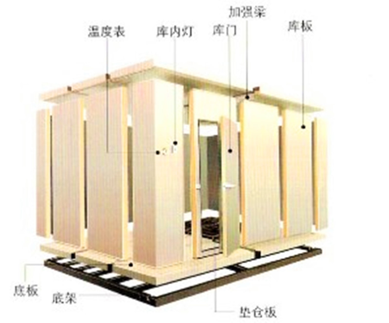 库体采用板壁内部预埋件扣式联接。拆卸搬运方便,组装启用时间短,安装周期仅是土建冷库的1/30~1/20,中小冷库一般3~5天即可交付使用,这对部队、厂矿等流动单位和边远地区尤为适宜。