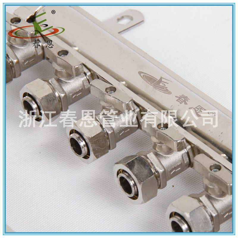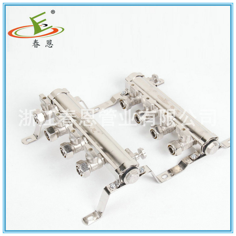 分、集水器(manifold)是水系统中,用于连接各路加热管供、回水的配、集水装置。按进回水分为分水器,集水器。所以称为分集水器或集分水器, 俗称分水器。地暖、空调系统中用的分水器材质宜为黄铜、自来水供水系统 户表改造用的分水器多为PP或PE材质。 供回水均设排气阀,很多分水器供回水还设有泄水阀。 供水前端应设“Y”型过滤器。 供水分水管各支管均应设阀门,以调节水量的大小。分水器常用于:1. 地板采暖系统中的,分集水器管理若干的支路管道,并在其上面安装有排气阀,自动恒温阀等,一般为铜质较多。口径小,多位DN25-DN40之间。进口产品较多。2. 空调水系统,或其它的工业水系统中的,同样管理若干的支路管道,分别包括回水支路和供水支路,但其较大多位DN350-DN1500不等,用钢板制作,属于压力容器类专业制造公司,其需要安装压力表温度计,自动排气阀,安全阀,放空阀等,2个容器之间需要安装压力调节阀,且需要有自动旁通管路辅助。3.自来水供水系统,分水器的使用有效的避免了自来水管理方面的漏洞,集中安装、管理水表,并且配合单管多路使用降低了管材采购成本,而且极大的降低了施工时间,提高了效率。自来水分水器通过异径直接连接于铝塑主管道,在水表池(水表房)中集中安装水表,做到一户一表,户外安装、户外查看。目前全国各地户表改造正在大范围进行中。