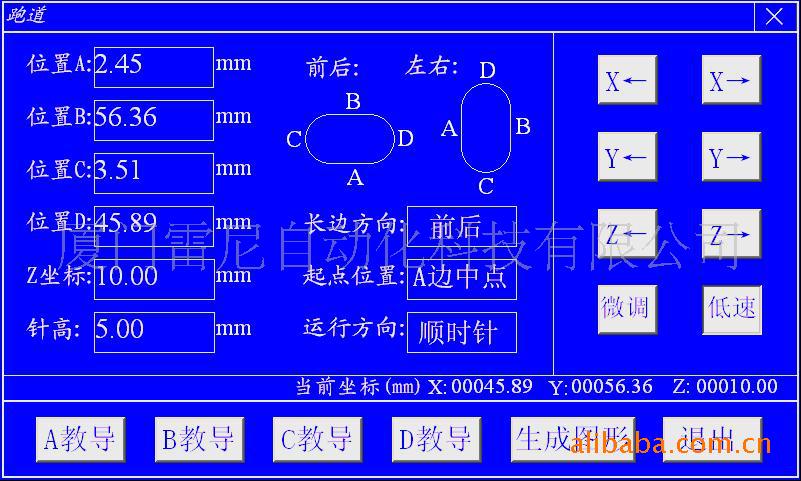 特别提示:顺时针和逆时针运动跟选点的顺序有关;若要画圆涂胶,可把B点类型改为“整圆”,当作圆来处理,编程方法同上。